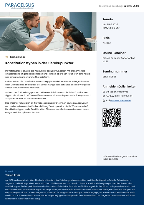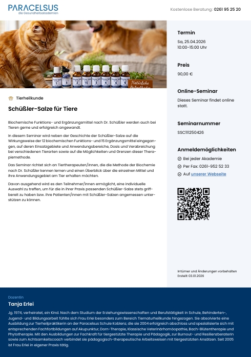 Genaue Kursdaten, Studienorte und Gebühren sind unter www.paracelsus.de zu erhalten (Seminarflyer siehe unten).